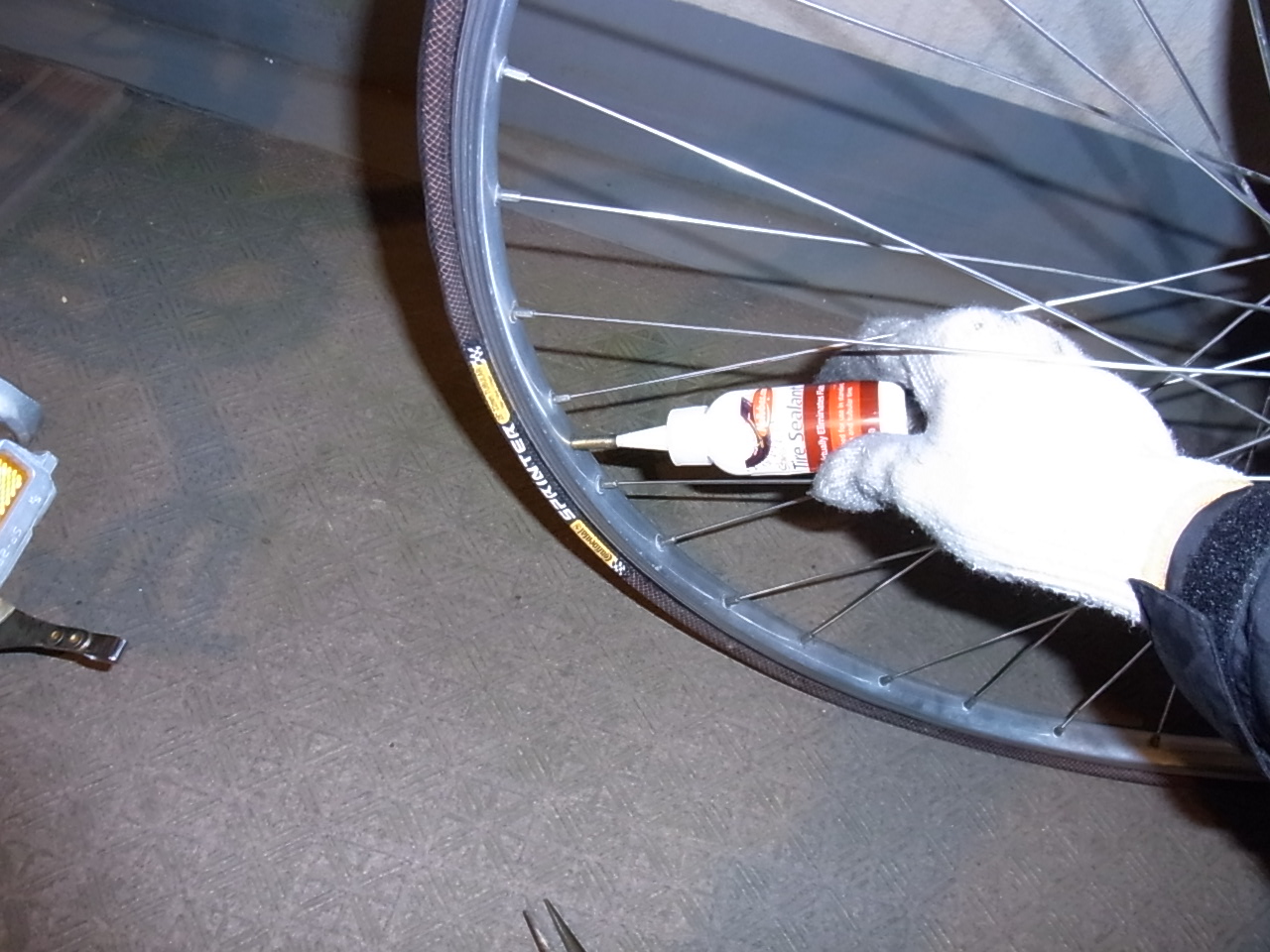 次にパンク防止剤を注入します。選んだのはNotubes.comのパンク防止剤TireSealantを入れてみました。