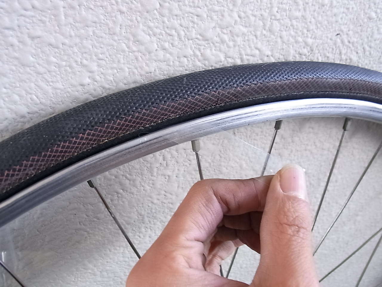 中で切れちゃうので丁寧に引っ張ります。剥がしたら一回空気を入れて、試走して、また空気を抜きます。