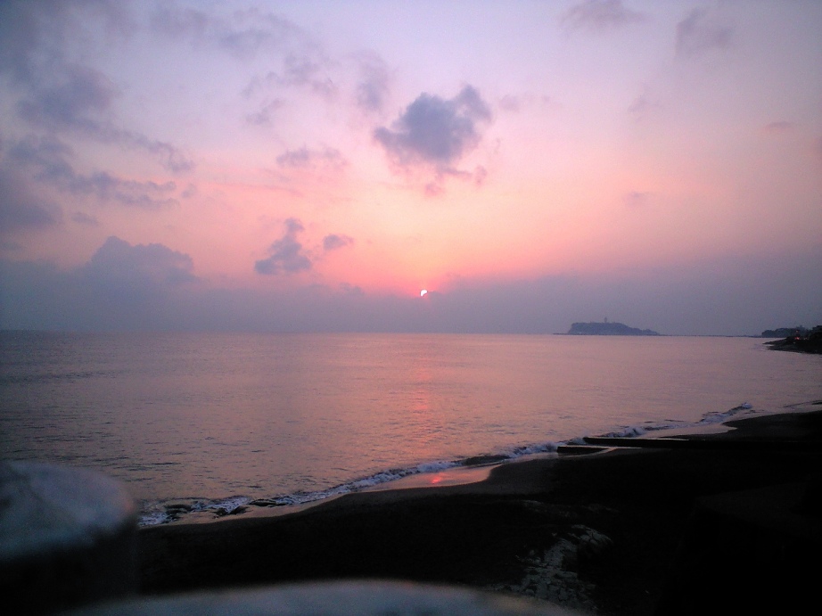 江ノ電の線路を超えると、海が見えた。すでに日は傾き、夕日がとても綺麗だった。