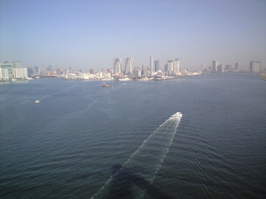 海浜公園に出て、レインボーブリッジを望む。これからあれを走って渡るのだ。橋は上下2段になってて、下の段を人が通れるようになっている。橋のたもとに歩行者の入り口があり、警備員がいた、勿論無料だが、自転車は通れないらしい。